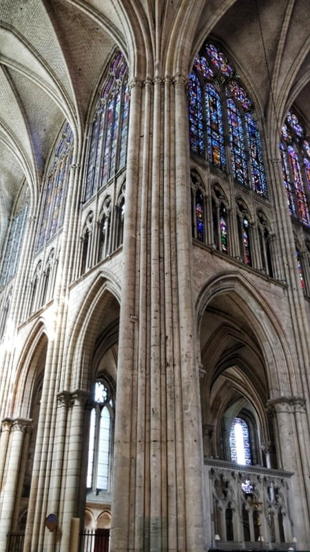 We lopen verder naar het centrum van Troyes. In Troyes zijn vele kerken te vinden én een kathedraal. Voor een bezoek aan de kathedraal wijken we even af van de route. In de kathedraal is het heerlijk koel. Het is een imposant bouwwerk met talloze dikke grijze pilaren in neo-gotische stijl.We treffen er ook glaskunst aan, waaronder een prachtig gekleurde kubus.