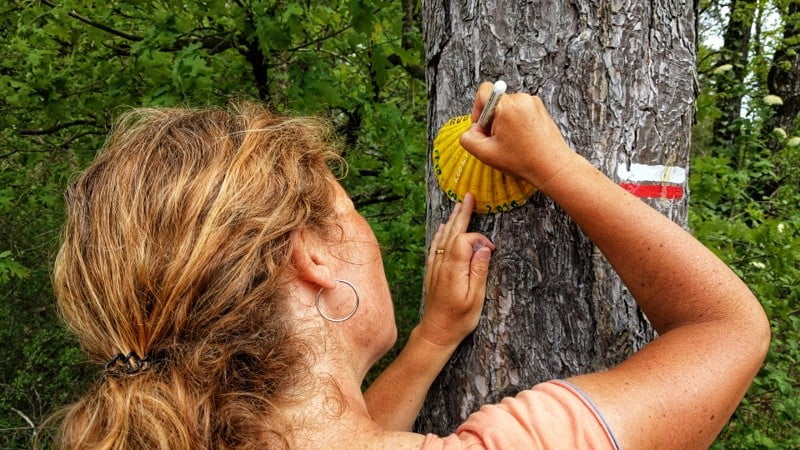 We stappen door de velden en zien hoe het landschap verandert naar hogere heuvels. We komen onderweg een boom met een gele schelp tegen waarop meerdere passanten hun naam hebben geschreven. We hebben die van ons erbij gezet.