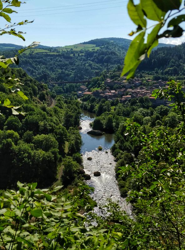 We dalen af naar het dorp Monistrol d’Allier. Een groot water verdeelt het dorp in tweeën. We lopen over de brug met het ruisende water beneden ons. Ernaast ligt een elektriciteitscentrale. In het dorp kopen we 2 sandwiches voor de lunch én natuurlijk voor ieder een pain au chocolat. Dat is onderdeel van onze bewezen formule om de dag goed door te komen. Hoog bij de kerk eten we onze pain au chocolat op, in de schaduw welteverstaan. Het is werkelijk bloedheet.