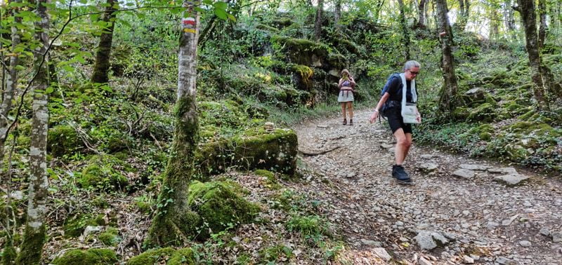 Vandaag lopen we 13 kilometer naar Rocamadour, voornamelijk door een prachtige en heerlijk koele kloof. We dalen veel af en volgen de droge bedding van de rivier L’Alzou. We lopen zelfs door een voormalige watermolen, waarvan nu nog slechts resten zichtbaar zijn. De hoge rotswanden om ons heen zijn imposant en laten je hier heel klein voelen. Wat een overweldigende natuur! Als we de kloof uit zijn, lopen we in de volle zon richting Rocamadour, nog steeds met de hoge rotswanden om ons heen.