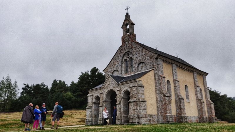 Halverwege de ochtend begint het wat te regenen. Oh, wat voelt dat weer vertrouwd om met regenkleding en regenhoes door Frankrijk te lopen. Het stelt niet veel voor gelukkig, en het zorgt wel lekker voor veel zuurstof in de lucht.We zien veel dennenbos, bremstruweel en graslanden omheind met grijze granietblokken als palen. Hierover spant men dan prikkeldraad. Ook de huizen zijn gemetseld van grijze granietblokken. Doordat zich in dit gebied ondoorlatend graniet bevindt, hoor je overal het water stromen in de slootjes.
