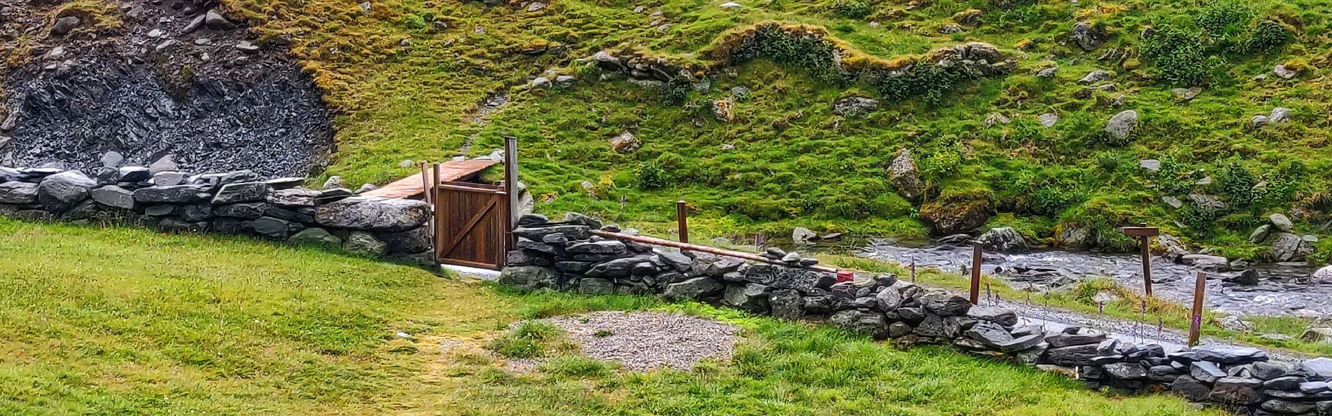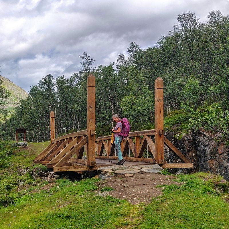 We lopen eerst 3 km over de “snelweg” (E6), aan de linkerkant. Al het tegemoetkomend verkeer wijkt met een grote bocht om ons uit. Meteen vanaf de 1e minuut is de omgeving adembenemend. Grote, lange watervallen slaan zich te pletter in de woeste rivier die langs de E6 loopt. De massieve rotswanden zijn grof gelaagd. Na 3 km verlaten we de snelweg en gaan we het graspad omhoog. De auto’s onder ons op de E6 worden speelgoedautootjes en het beeld van de trein die langs de rotswand een tunnel induikt lijkt op het diorama uit de Efteling. We lopen nog onder de boomgrens en genieten van al het prachtige groen. Het groen wordt opgefleurd met hele bossen blauw-paarse monnikskap. We stijgen alsmaar totdat we ver boven de boomgrens uitkomen.