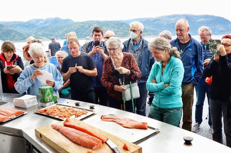 Om 11 uur geeft de chefkok een demonstratie hoe je een zalm fileert. Een prachtig grote zalm van zo’n 6 kg wordt met een vlijmscherp mes teruggebracht naar hapklare stukjes. En uiteraard mogen de gasten dit proeven🙂 . Wat is dat lekker!