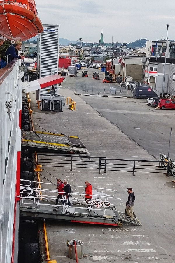Driemaal weerklinkt de scheepshoorn van MS Nordkapp om 9.30 uur… we zijn vertrokken uit Trondheim! Nog een laatste blik op de stad en de groene spits van de Nidarosdomen en dan gaan we weer zuidwaarts. We varen mee met de Hurtigruten (hurtig=snel; ruten=reis), de postboot die langs de kust van Noorwegen vaart.