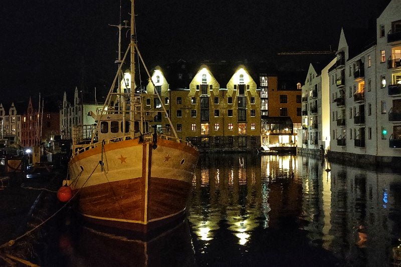 Deze dinsdag is nog maar een kwartier oud en wij staan al te wachten voor de scheepsdeur om (als enigen) naar buiten te gaan. We meren namelijk aan in Ålesund, de stad in de stijl van art nouveau en Jugendstil. Maar ja, het is pikdonker en het miezert wat, dus we zien er bar weinig van.