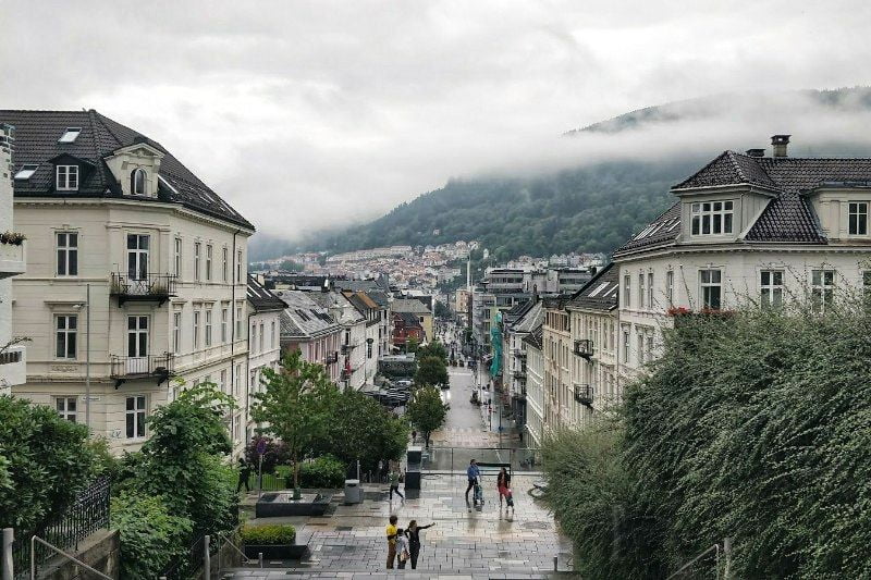 We meren in stijl af in Bergen, namelijk in de regen… Bergen is de stad waar het het meest regent in heel Europa. Op minstens 300 dagen per jaar valt hier regen.