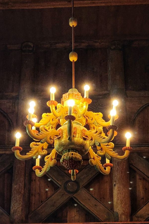We bezoeken eerst de houten staafkerk van Ringebu waarboven nu een prachtig blauwe lucht zichtbaar is. Als pelgrims hebben we gratis toegang tot deze kerk, die stamt uit de vroege 13e eeuw. Om het zo warm mogelijk te houden in de kerk, werden er geen ramen gemaakt. Het interieur is helemaal van hout, zelfs de immense kroonluchter.