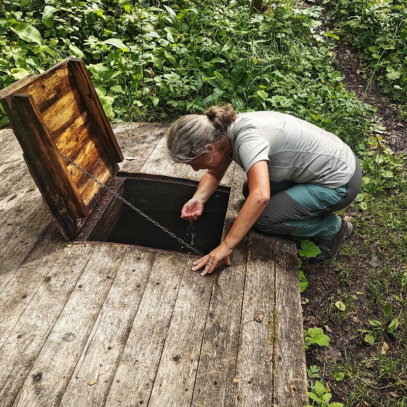 We houden pauze bij een ‘Olavs källa’, een waterbron gewijd aan de heilige Olav. Er is ook een stempel te vinden. Deze bevindt zich in een houten “vogelhuisje”, dat ook letterlijk als vogelhuisje dient, want door de verrotte bovenkant is een vogeltje in staat geweest in het kastje een nestje te maken.