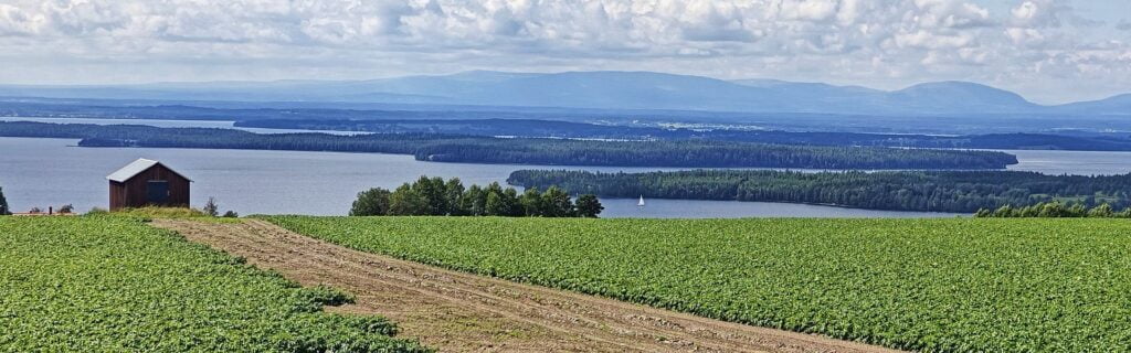 De route vandaag is schitterend, door het heuvelachtige landbouwgebied met aardappel- en gerstvelden en over mooie, frisgroene bospaden. En daarbij altijd aan onze linkerhand een geweldig uitzicht over het grote meer met daarin kleine eilandjes en daarbij op de achtergrond een aftekening van de bergen. Dit is voor ons Zweden op z’n mooist!