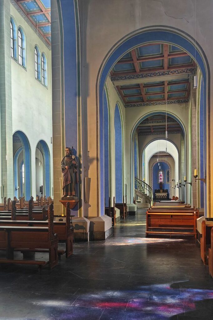 Leo heeft op z’n verlanglijstje voor Aken ook nog de Jacobskirche staan, want ja: Santiago-pelgrim ben je niet alleen op de Camino, maar voor het leven. De kerk is gesloten, maar de pelgrimskapel is wel open. Van hieruit is er een mooi doorkijkje in de kerk.