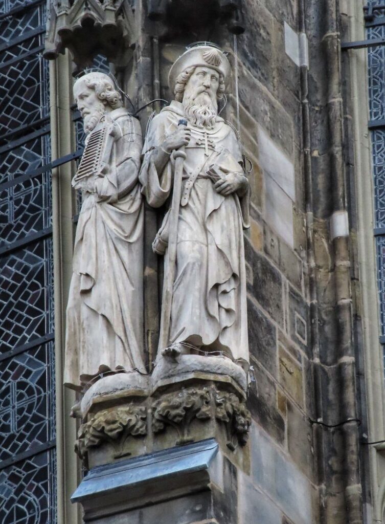 We komen Aken op een natuurrijke manier binnen door het park over de Lousberg. Mooi hier nog lunchpauze gehouden, voordat we ons in de mensenmassa van het centrum gaan begeven. Nu we hier toch zijn, willen we de Dom bezoeken waar Karel de Grote ligt begraven te midden van een hoop pracht en praal. Heel indrukwekkend, maar voor ons net iets over de top. Aan de buitenkant spotten we nog wel het beeld van Jacobus.